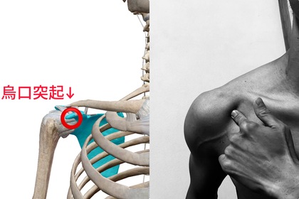 大事な役割を持った鎖骨を、わざわざ動けなくしているのが、いまの体幹トレーニングなんです。体幹トレに、腕立て伏せのような体勢をキープし、インナーマッスルを鍛えることを目的にしたものがありますが、両腕を立てて鎖骨が動かせない状態にしているわけですから、いくら続けても動ける身体にはなりません。 鎖骨を使えるようにするには、そうやって固めてしまった筋肉、ポイントは烏口突起(肩甲骨の一部で上腕骨との接続部に位置する)のあたりなんですが、ここをゴリゴリと強くほぐす。すると鎖骨が自由になり、肩甲骨全体が自然に動き出す。